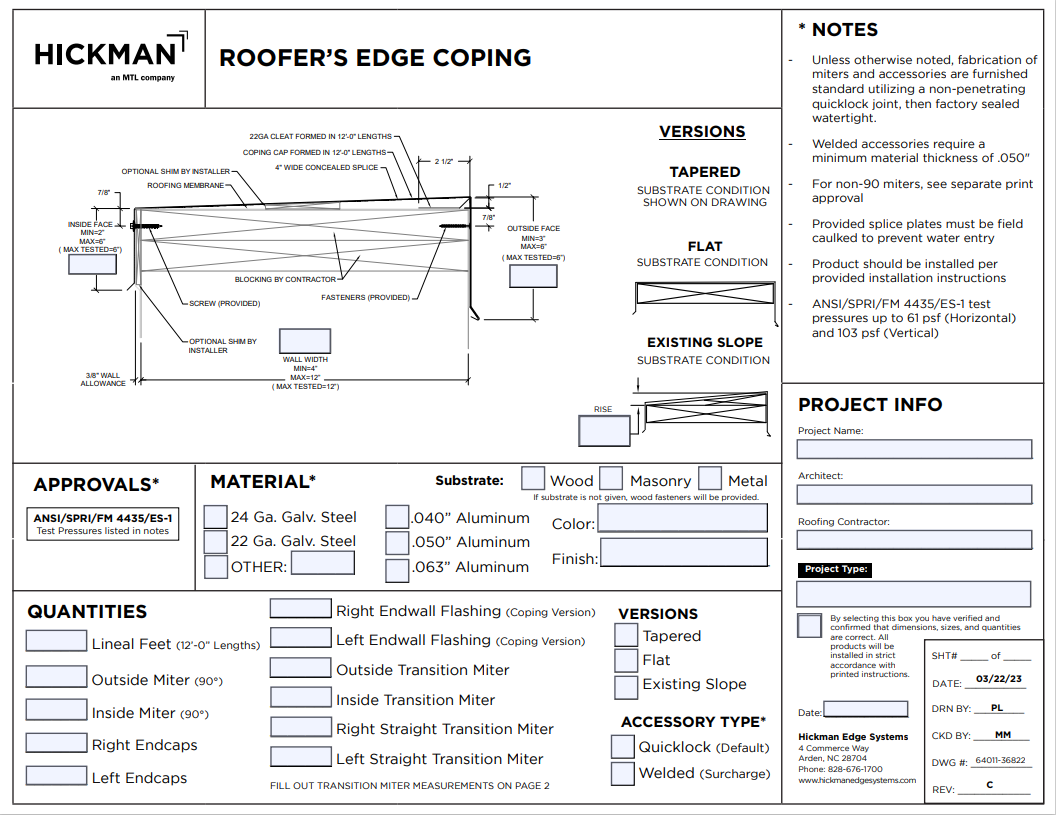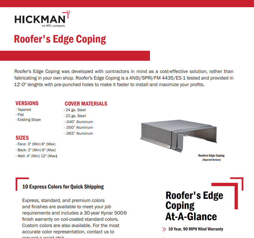 Roofer’s Edge Coping is designed for parapet walls ranging from 4 to 12 inches wide and is compatible with all commercial roofing systems. Key features include: