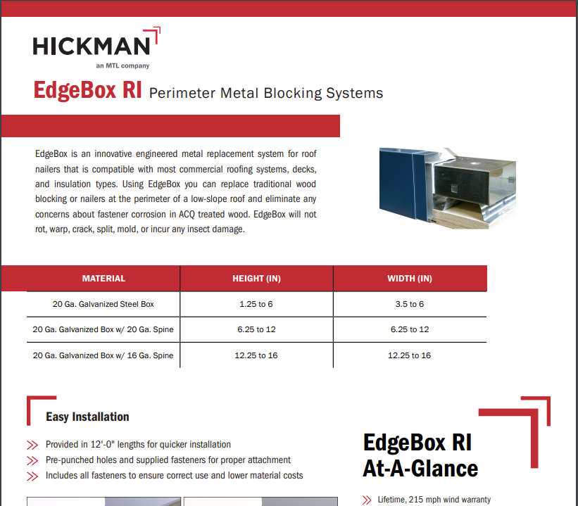 EdgeBox is an innovative engineered metal replacement system for roof nailers. Key benefits include: