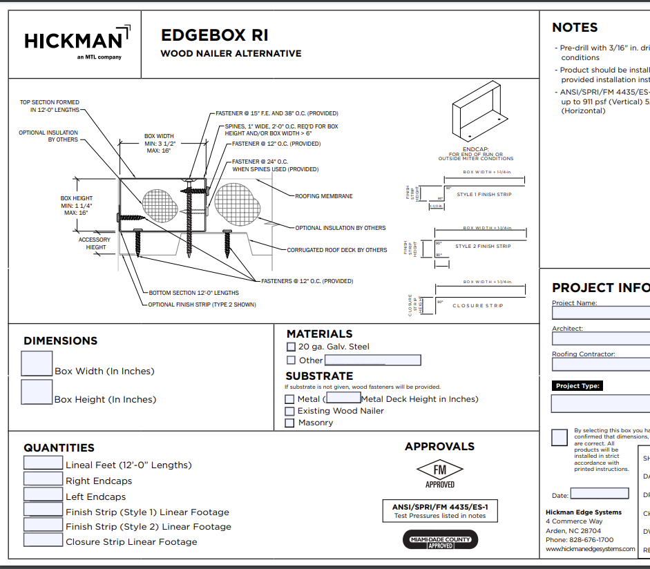 EdgeBox RI is designed to replace traditional wood nailers on any type of commercial building. The system is custom made for the application and available in virtually any height/width combination up to 16-inches. Call Hickman Edge Systems for larger sizes.