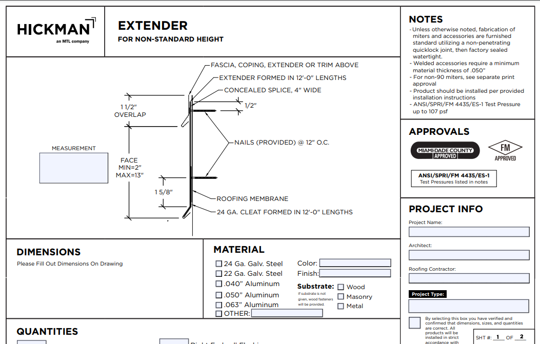 Hickman Edge Systems Extenders are easy to install, and consist of a 24 Ga. galvanized continuous cleat and a formed fascia extender. Our Extenders are available in 12-ft. lengths and with a variety of face heights to accommodate most requirements.