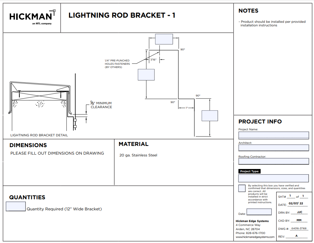 Hickman's Lightning Rod Brackets provide secure attachment of lightning rods to the roof system, protecting buildings from lightning strikes. Key features include: