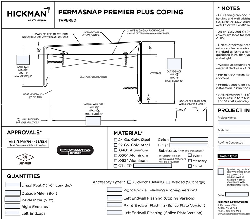 PermaSnap Premier Plus Coping Order Specification