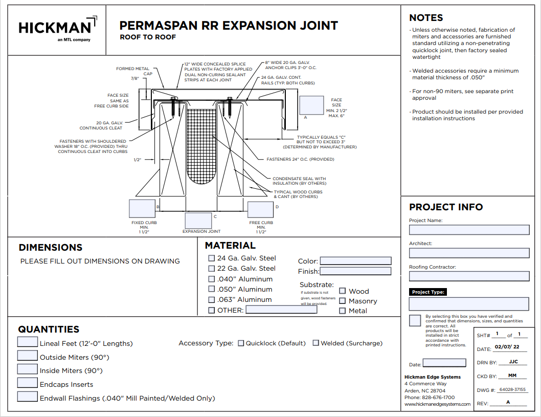 PermaSpan RR Expansion Joints are ideal for allowing thermal movement and condensation control between two roof systems. Key features include: