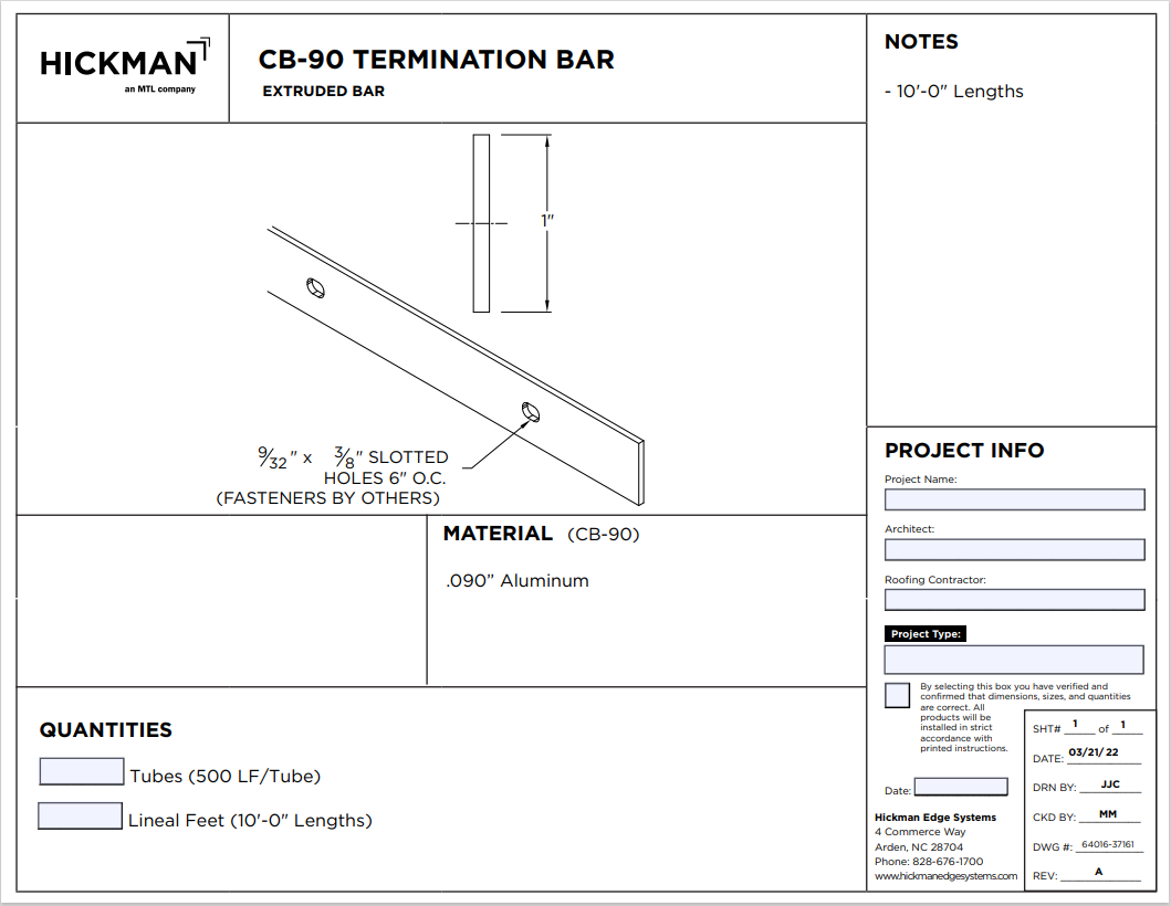 Hickman Edge Systems' CB-90 Termination Bar is designed for all types of roof systems. Key features include: